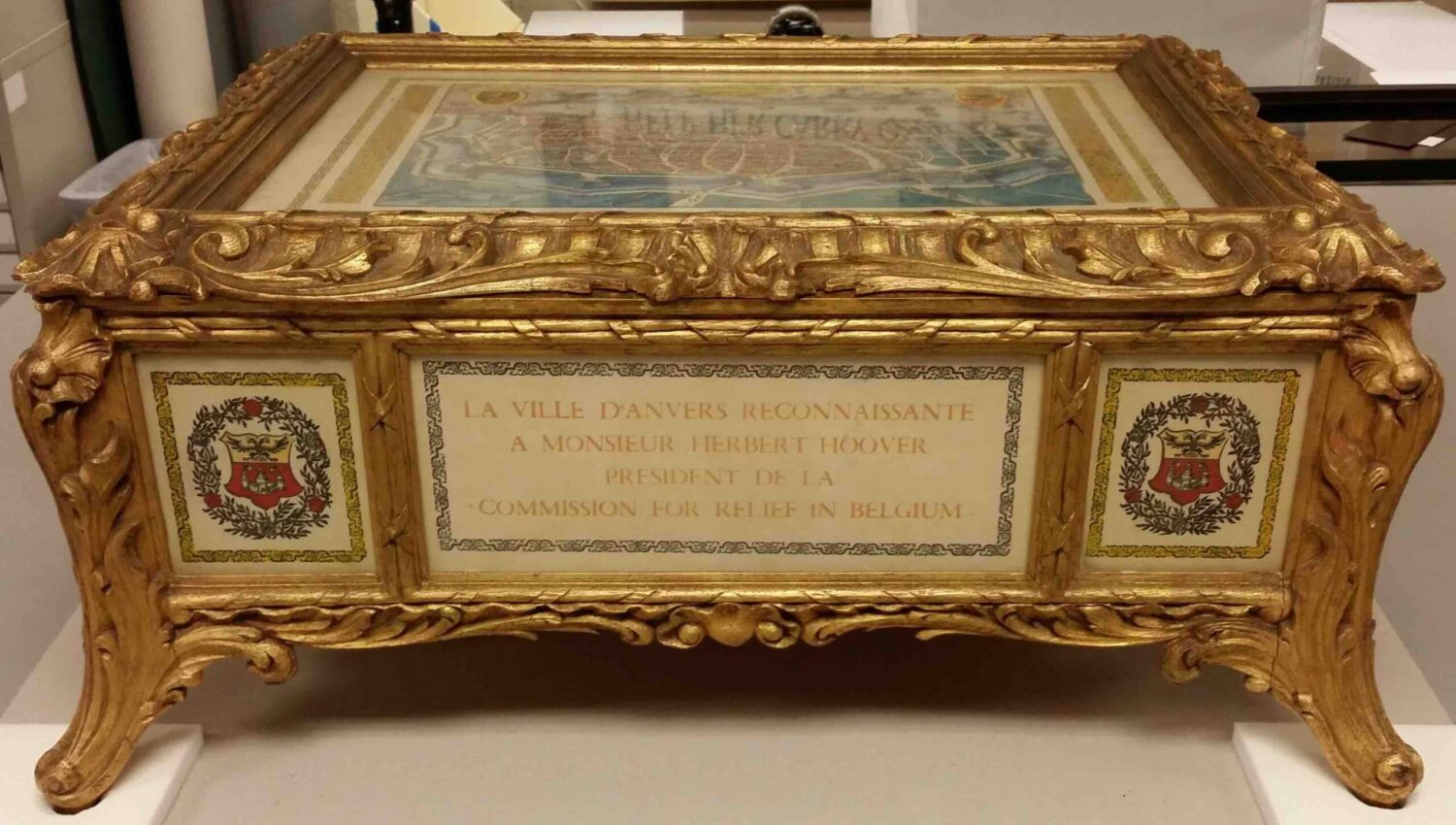 This gilded wood-carved box with inlays was a gift from the City of Antwerp to Herbert Hoover, director of CRB, 1918. Coll. and photo HILA