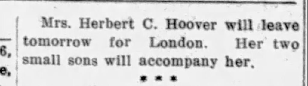 At the time Lou Henry Hoover was with their two sons Herbert Jr, age 11, and Allan, age 7, in California; she had brought the sons to safety from the dangers of the war in Europe. [14]