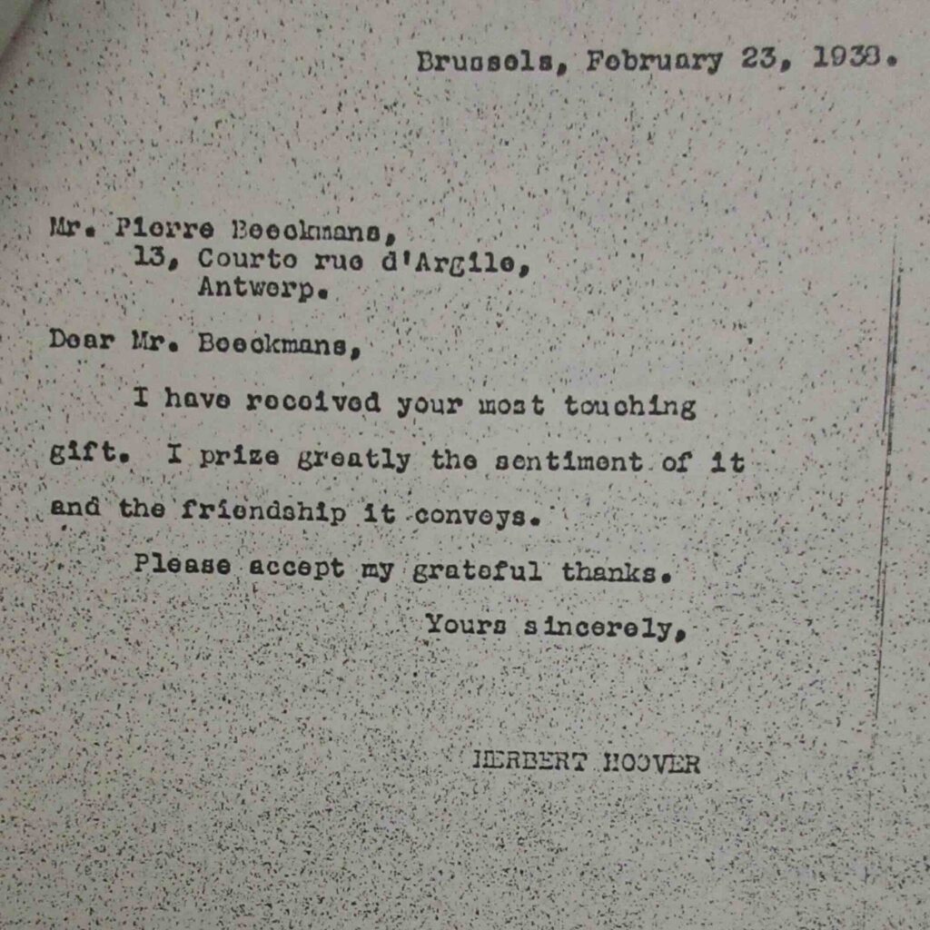 Beekmans donated the painted flour sack to Mr. Hoover on his own behalf, not at the behest of the Antwerp authorities. Beeckmans had an “Agency that prepares and carries out all publicity” and likely sought attention for himself and his work in 1938.