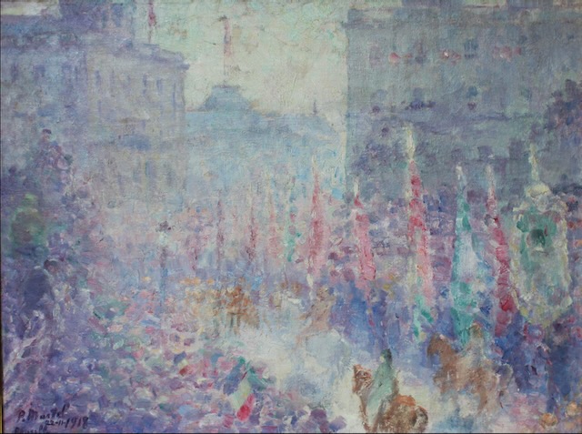 PAUL JEAN MARTEL was 36 jaar in 1915 (ºLaken, België, 04-08-1879 +Philadelphia, Penn. VS, 26-09-1944). Martel nam deel aan de tentoonstelling in Oudergem. Hij bewaarde een lege meelzak en heeft deze uitzonderlijk beschilderd ná de bezetting. Martel schilderde de heroïek van de ‘Blijde Inkomst van koning Albert en koningin Elisabeth op 22 november 1918’. Het licht schittert op de meelzak; kleurrijke pasteltinten geven Martel’s blijdschap weer, gedeeld met duizenden mensen in Brussel.