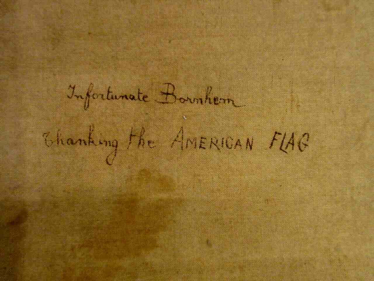 Op de achterzijde van het schilderij de originele print van de meelzak American Commission. En de tekst – een kwartslag gedraaid – ‘Infortunate Bornhem Thanking the AMERICAN FLAG’ (Ongelukkig Bornem, de Amerikaanse vlag dankend).