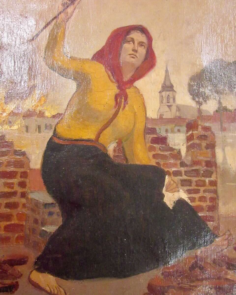 Ze rijst blootsvoets op uit de ruïnes, toont eerst haar zwarte rok, vervolgens het gele jak, dan de hoofddoek in rood, alsof de Belgische natie zich opheft uit de ruïnes.