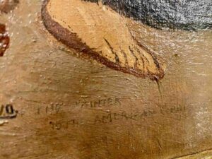 Tony van Os schilderde zijn kunstwerk in de verwarrende omstandigheden van de oorlog; dit werk valt onder de noemer ’trench art’, loopgravenkunst, het draagt de weerklank van het conflict.