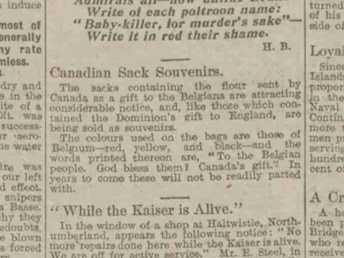 Dit bericht in Canadese krant spreekt abusievelijk over ‘empty sacks which had contained the Canadian gift flour for Belgians’. Dit had moeten zijn ’the Canadian gift flour for Britain, the Motherland’, 8 december 1914