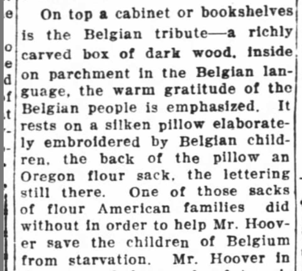 Na het uitbreken van de oorlog zamelden de Amerikaanse en Canadese bevolking hulp in voor de Belgische bevolking, daardoor bereikten duizenden kilo’s tarwemeel verpakt in handzame zakken in de eerste oorlogswinter hongerige vrouwen, mannen en kinderen.