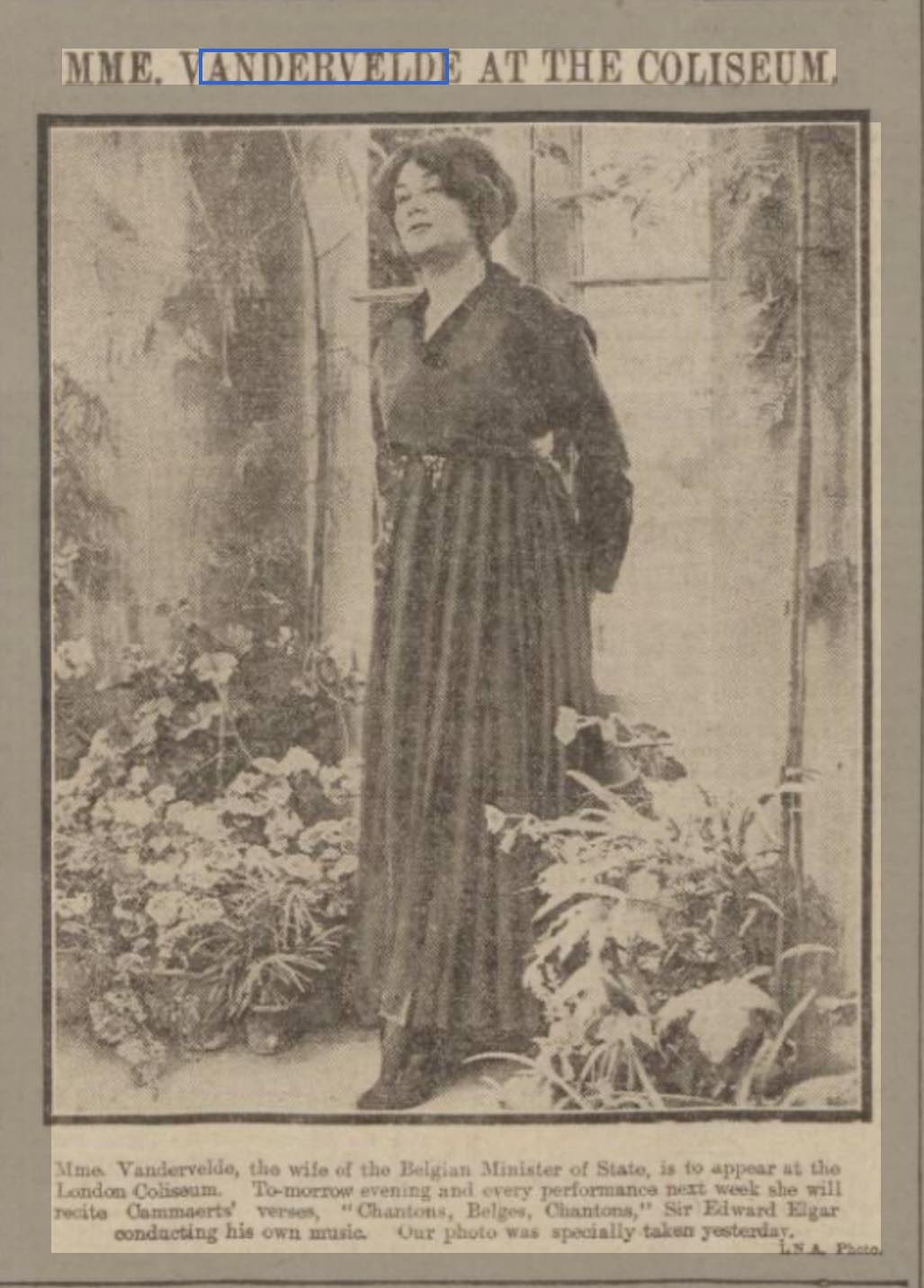 On September 18th, in the Evening World, the evening edition of the New York World, correspondent Alexander Powell’s newspaper, an article with photo appeared under the headline “Mme. Vandervelde brings note from Queen Elizabeth. Wife of Belgian Minister of State Here to Appeal to Americans. Woman envoy here to appeal for aid for destitute Belgians.”